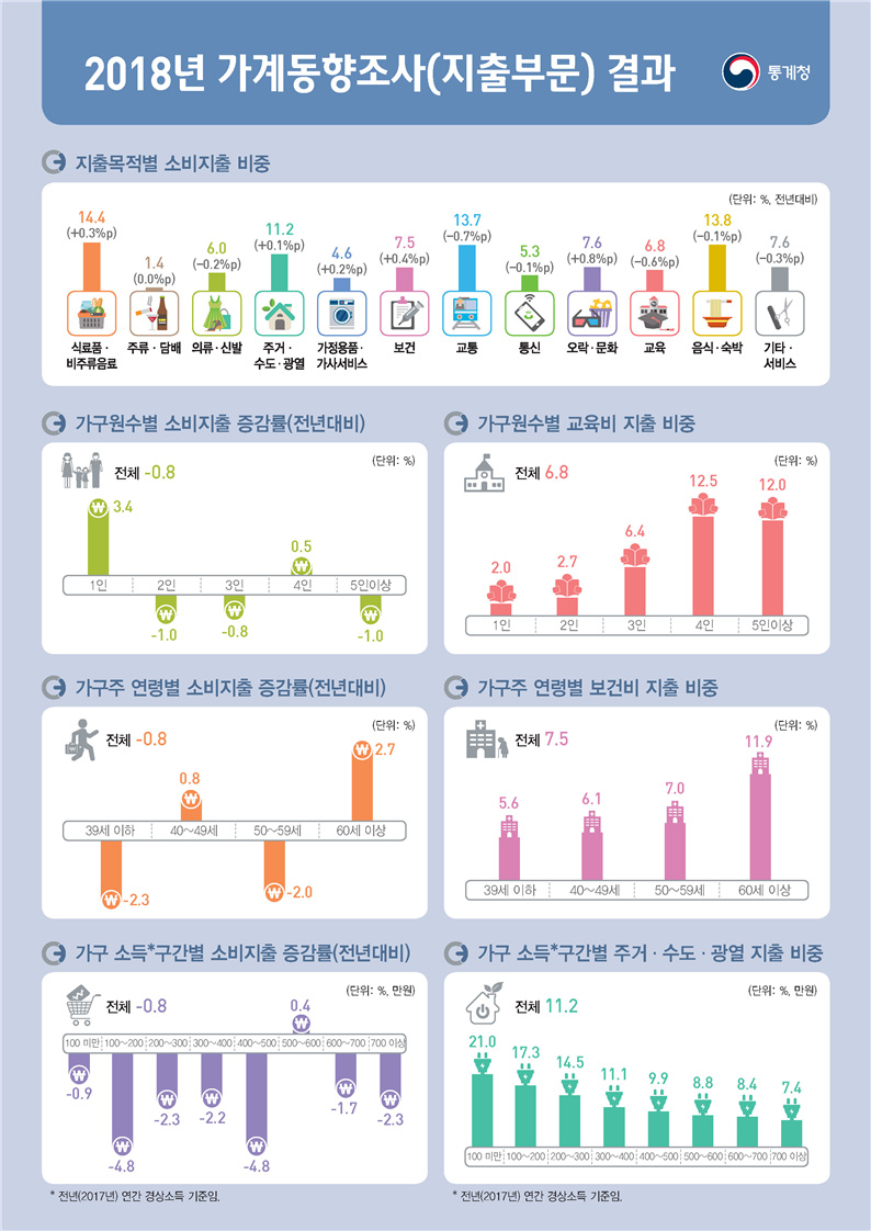 "식료품․비주류음료(14.4%), 음식․숙박(13.8%), 교통(13.7%), 주거․수도․광열(11.2%) 순으로 지출 비중이 높음. 전년대비 교육, 교통, 기타상품․서비스 등은 감소, 오락․문화, 보건, 가정용품․서비스 등은 증가" 라는 분석도 우리 처지랑 별 차이없는 것 같다. 우리가 사는 표준이군.