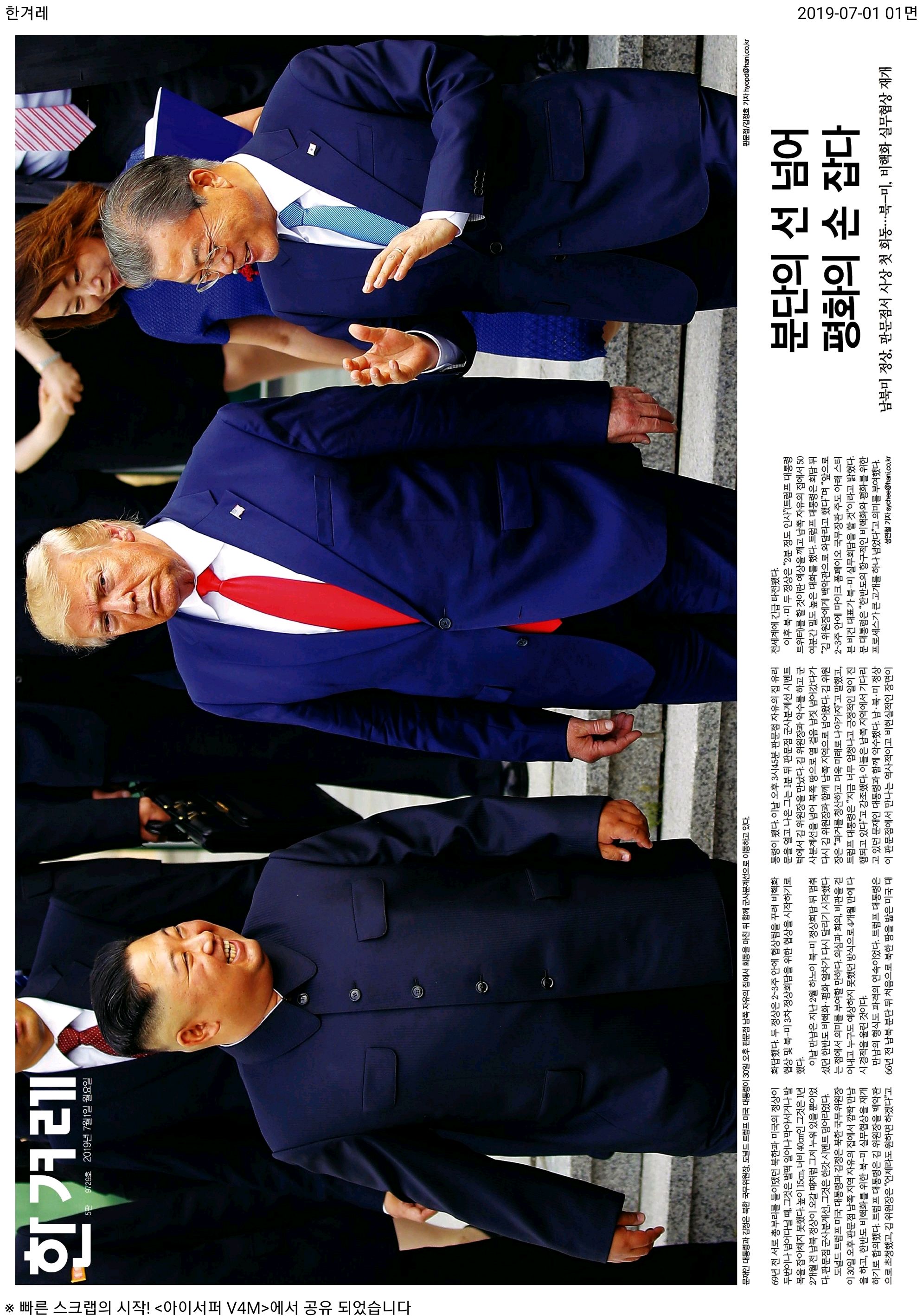 1면은 사실 비주얼이다. 다르게 생각하는 기자들도 많이 있겠지만, 음... 대부분이겠지만, 1면엔 텍스트로 설명하기보단 그림으로 보여줘야 효과적이다. 물론 이런 세기의 사건에 버금가는 일이 있을 때 이야기다. 난 개인적으로 서울신문 편집이 가장 마음에 든다. 트럼프의 첫 북한땅 밟기보다 세 정상이 분단국의 상징인 판문점에서 만났다는 점이 더 의미있다 생각하기에.