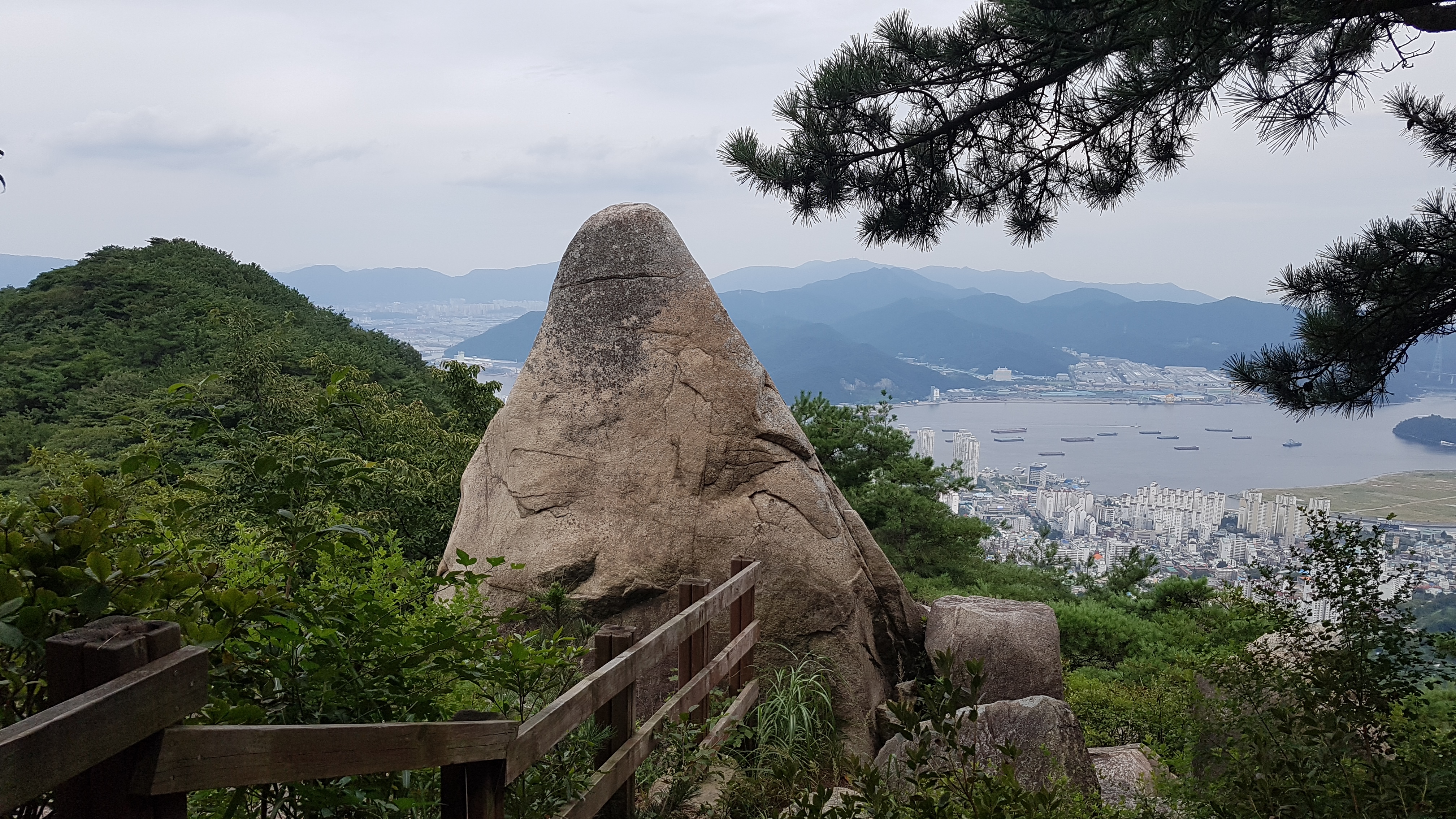 산 정상에서 내려오는 길. 마산 시내와 앞바다가 훤히 내려다 보인다. 멀리 보면 섬들이 바다를 균형있게 채워놓은 게 꼭 다도해같다.