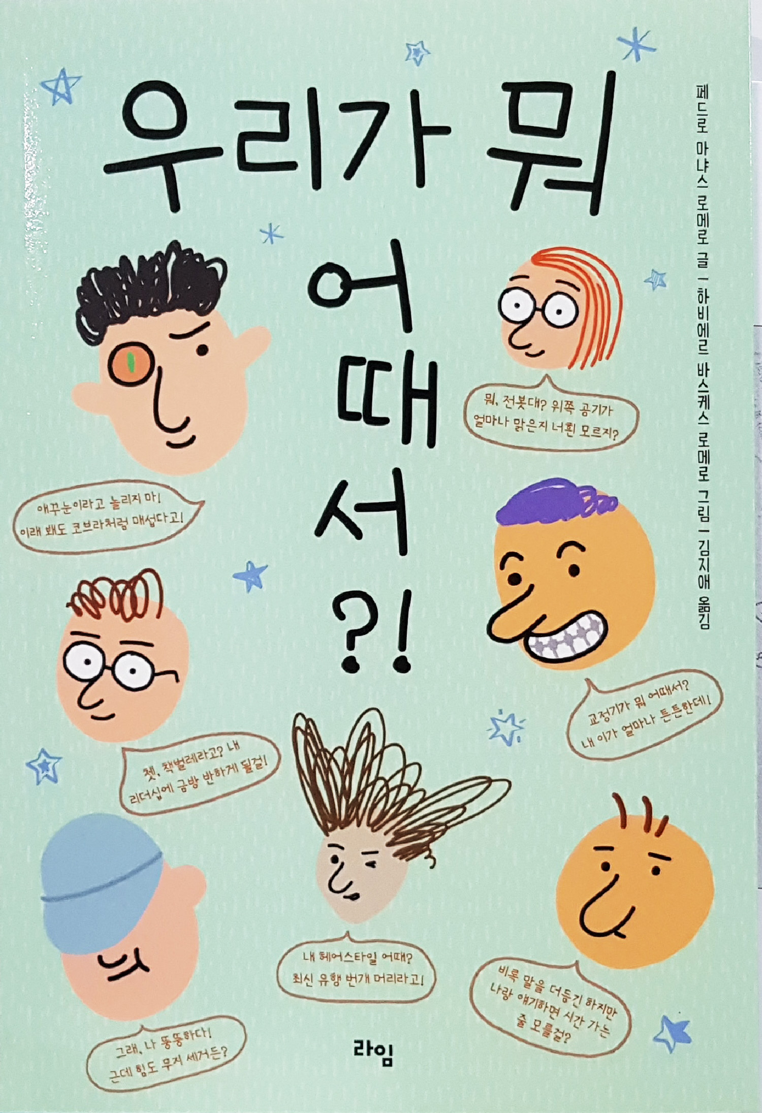 ◇우리가 뭐 어때서?! = 이 책은 모두 특별한 사람이라는 메시지를 유쾌하게 풀어낸 동화다. 자콥의 제안으로 옛날 체육관에 모은 운동장 모퉁이 아이들은 그동안 느꼈던 울분을 시원하게 털어놓고 함께 비밀 클럽 ‘고집불통’을 결성한다. 그리고 자신들만의 장점을 마음껏 발휘한다. 페드로 마냐스 로메로 글·하비에르 바스케스 로메로 그림·김지애 옮김. 라임 펴냄. 128쪽. 9500원.