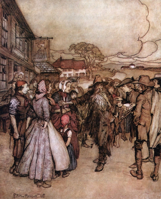 이야기는 딱 잘라 립 밴 윙클이 총을 메고 산으로 사냥을 떠나기 전과 후로 나뉜다. 마누라한테는 꼼짝도 못하고 마을사람들에겐 이용당하고 아이들에겐 바보소리를 듣는 답답한 남자 립 밴 윙클. 이 양반이 전설이 되는 과정을 따라가보자.