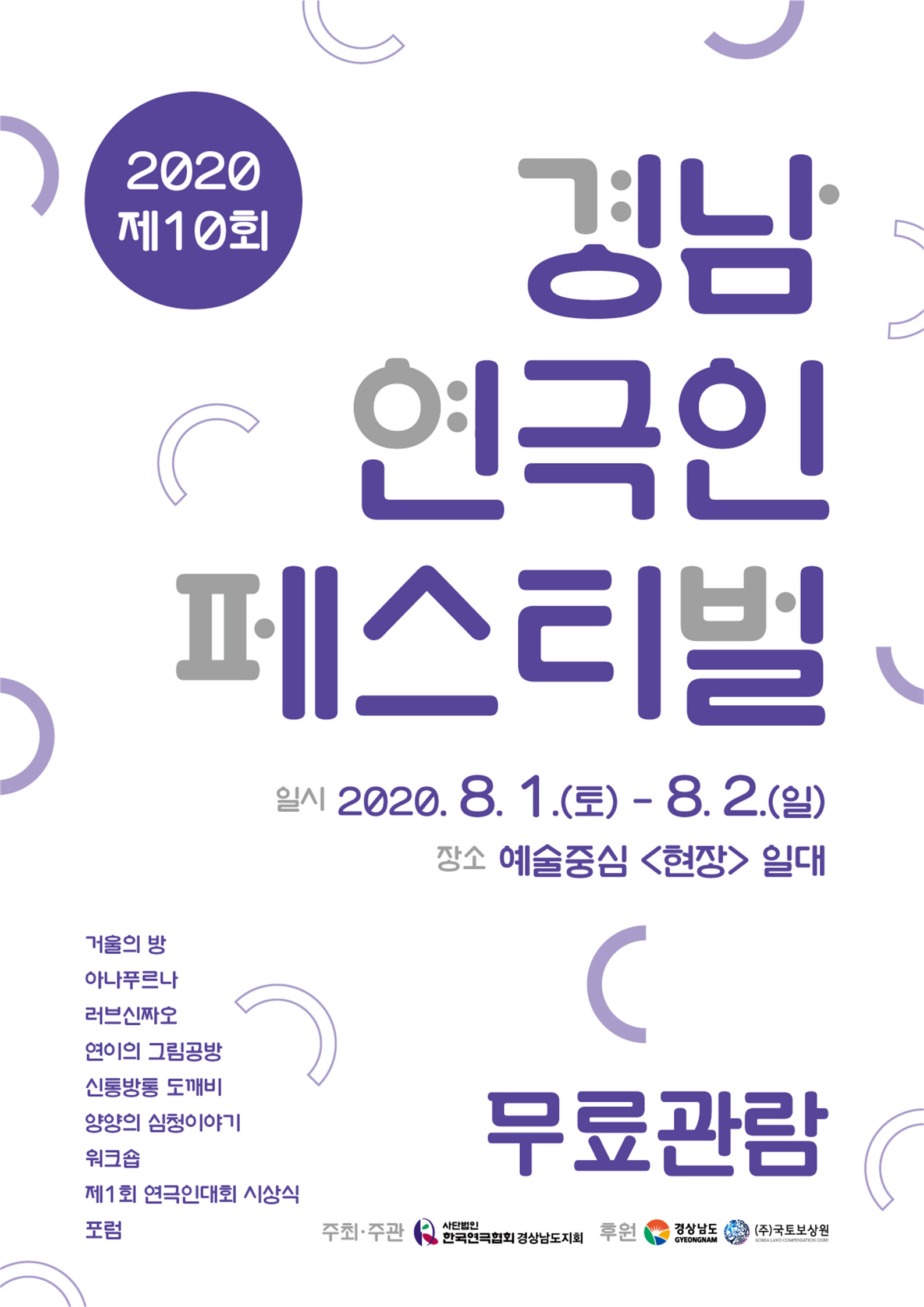 (사)한국연극협회 경상남도지회가 주최하고, 경상남도와 ㈜국토보상원이 후원하는 제10회 경남연극인페스티벌이 8월 1일(토)부터 2일(일)까지 이틀 동안 복합문화공간 ‘예술 중심(Art Center) 현장’ 일대에서 진행될 예정이다.