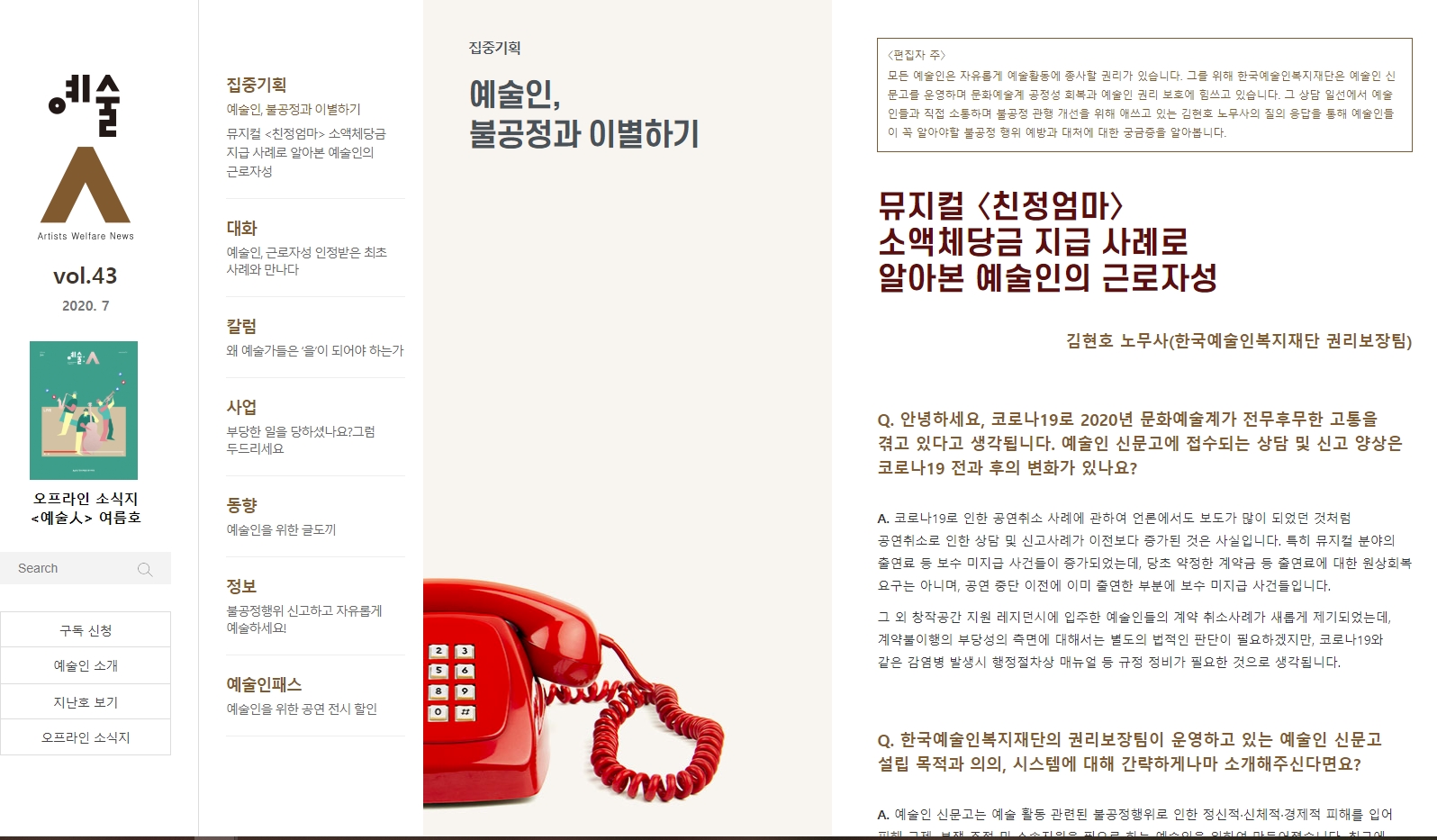 "모든 예술인은 자유롭게 예술활동에 종사할 권리가 있습니다. 그를 위해 한국예술인복지재단은 예술인 신문고를 운영하며 문화예술계 공정성 회복과 예술인 권리 보호에 힘쓰고 있습니다." 이번 호 '예술인 불공정과 이별하기' 집중기획 전문이다.