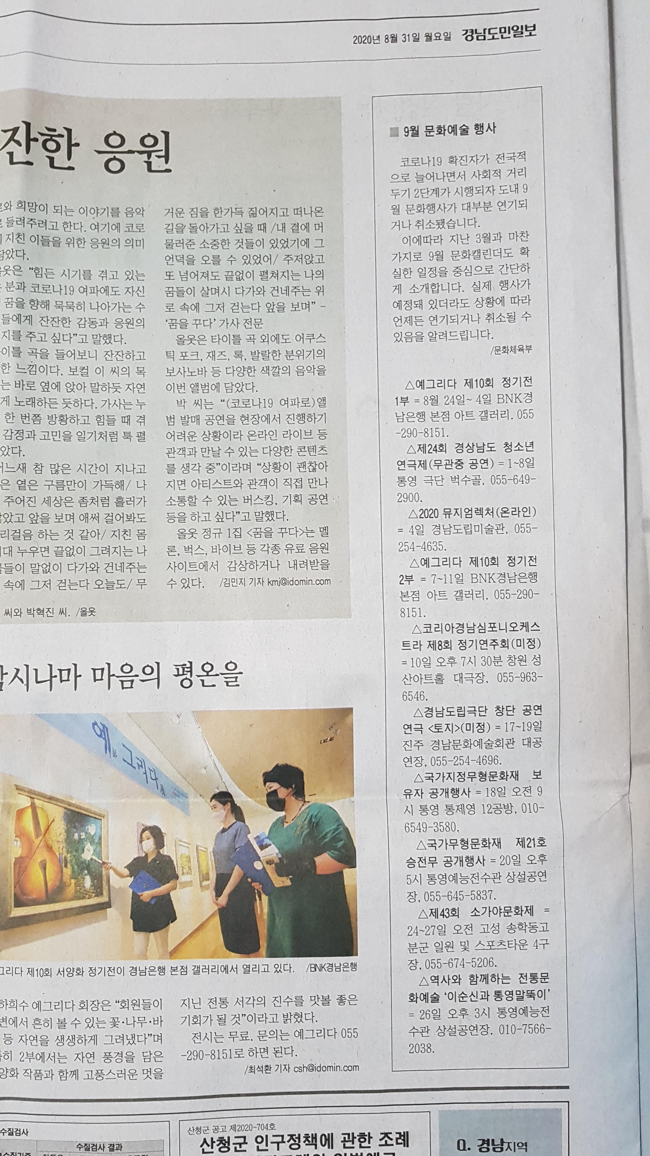 <경남신문>은 오늘 '공연 전시 줄취소… 한숨짓는 예술인에 희망을'이라는 사설을 냈다.