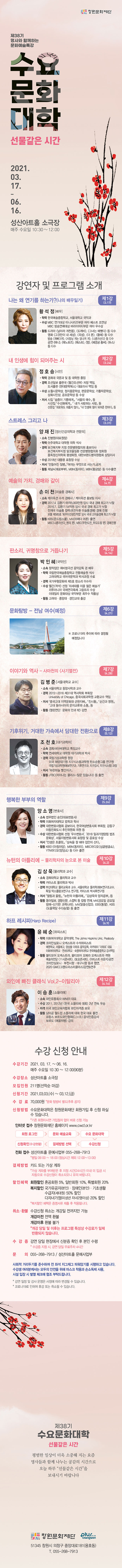 창원문화재단은 지친 일상에 작은 선물을 준비하는 마음으로 제38기 수요문화대학을 개강한다. 3월 17일 제1강, 배우 황석정의 <나는 왜 연기를 하는가?>(나의 배우일기)를 시작으로 매주 수요일 오전 10시 30분 시민들을 찾아올 예정이다.