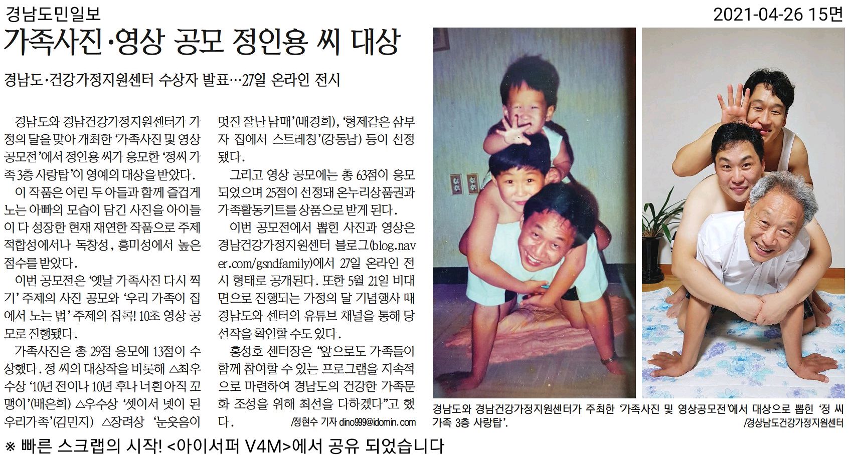 결과가 나오고 심사했던 우리 사진 기자가 보도자료보다 먼저 연락이 온다. 기사 다뤄달라고. 건강가정 관련해 내가 관심이 많으니 이런 부탁은 얼씨구나 하고 받아 쓰긴 했는데... 건강가정지원센터 운영위원이기도 해 직접 기사를 쓰는 게 자연스러울지는 모르겠다. 사심이 전혀 들어있지 않아 떳떳하긴 한데, 모양새가...