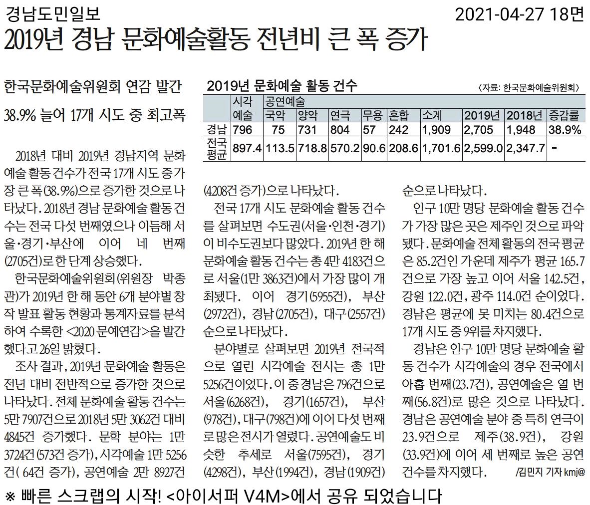 문화예술위원회가 해마다 발행하는 <문예연감>을 분석한 김민지 기자의 기사다. 경남만 한정했다. 경남지역 신문이라 그럴 수밖에 없긴 하다. 그런데 비교 통계를 보니 경남에서 문화예술활동이 아주 활발함을 알겠다.