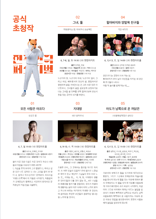 작품은 “공식초청작” 중 유진규 몸의 ‘모든 사람은 아프다’가 6월 7일(월) 19:30에, 마임공작소 판, 어처구니 프로젝트의 ‘그녀, 둘’이 6월 7일(월)~8일(화) 19:30에, 극단 완자무늬의 ‘지대방’이 6월 9일(수)~10(목) 19:30에 공연하며, 극단 사다리의 ‘할아버지와 양말목친구들’이 6월 12일(토)~13(일) 14:00에, (사)문화창작집단 공터다의 ‘아도가 남쪽으로 온 까닭은’이 6월 12일(토)~13일(일) 19:30에 공연한다.