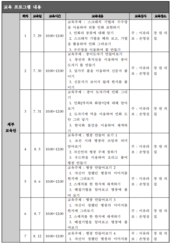 창원문화재단(대표이사 임웅균)은 지역 특성을 살린 교육 콘텐츠를 개발하고 전통문화시설을 활용한 지역민의 문화예술교육의 기회를 확대하기 위해, 오는 7월 6일부터 창원역사민속관에서 예술교육 프로그램을 운영한다.