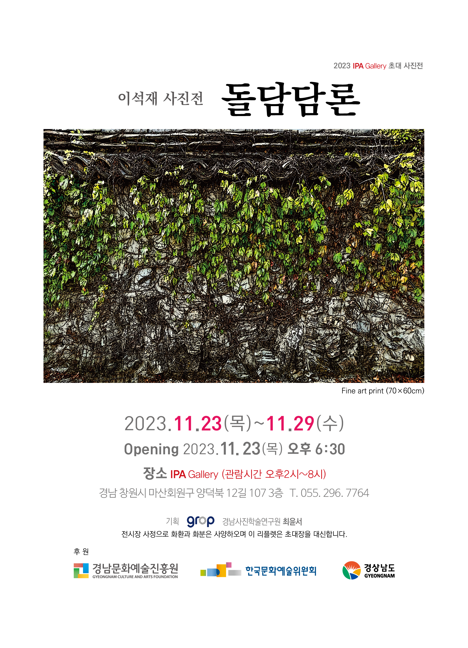 이석재 사진가의 일곱번째 사진전“돌담담론”이 11월23일부터 11월29일까지 창원시 양덕동 소재 IPA갤러리(대표 김관수)에서 열린다.