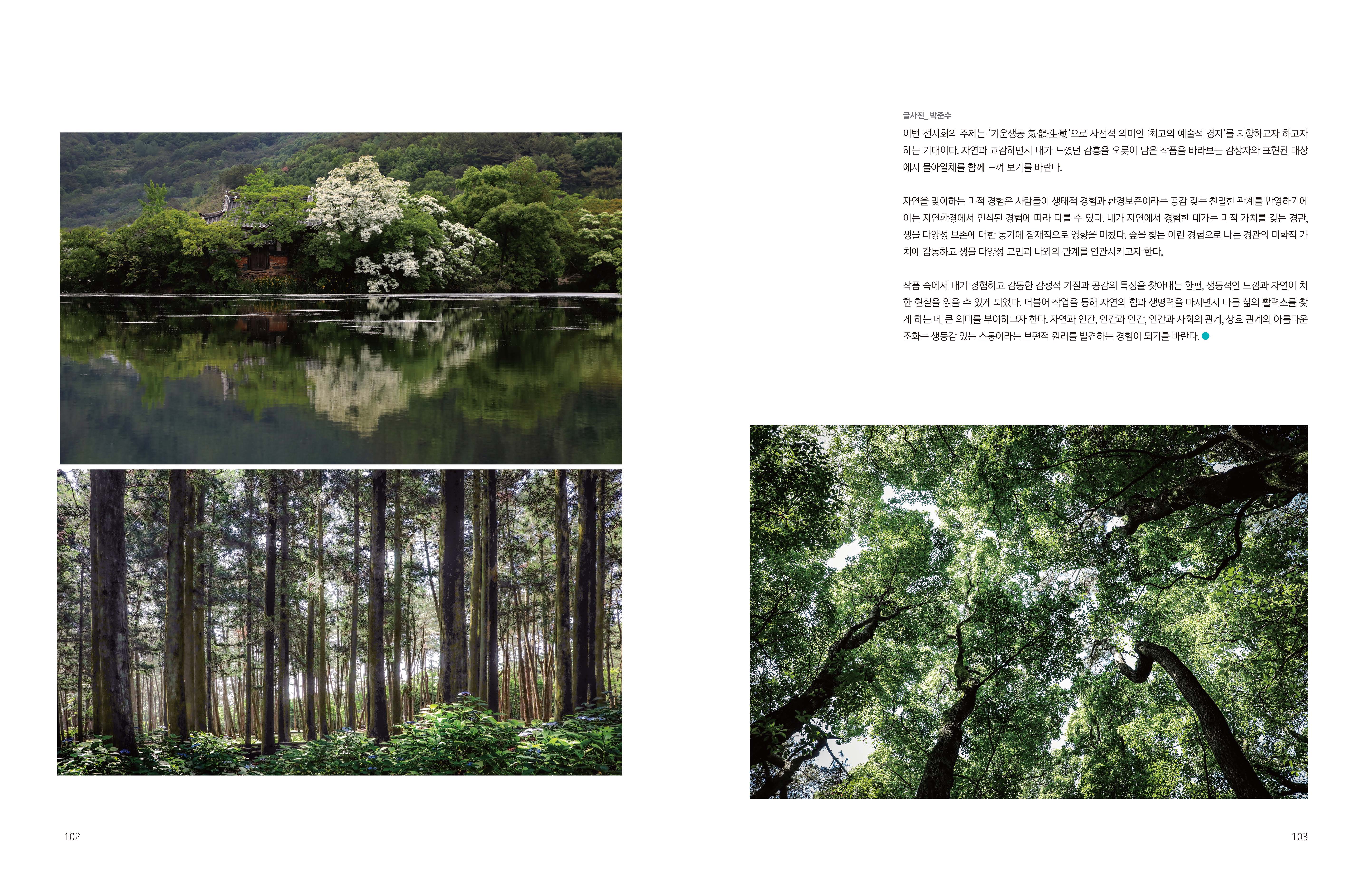 자연과 교감하면서 느꼈던 감흥을 오롯이 담은 전시된 작품을 바라보는 감상자와 표현된 대상에서 물아일체를 느끼시기 바랍니다