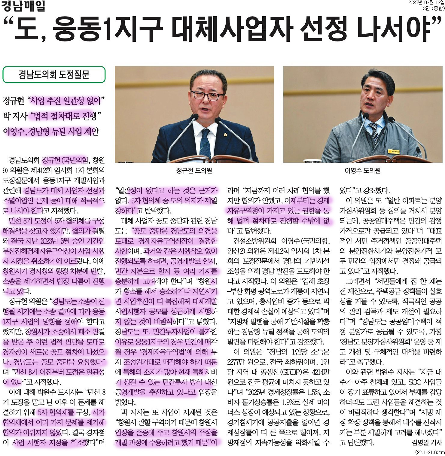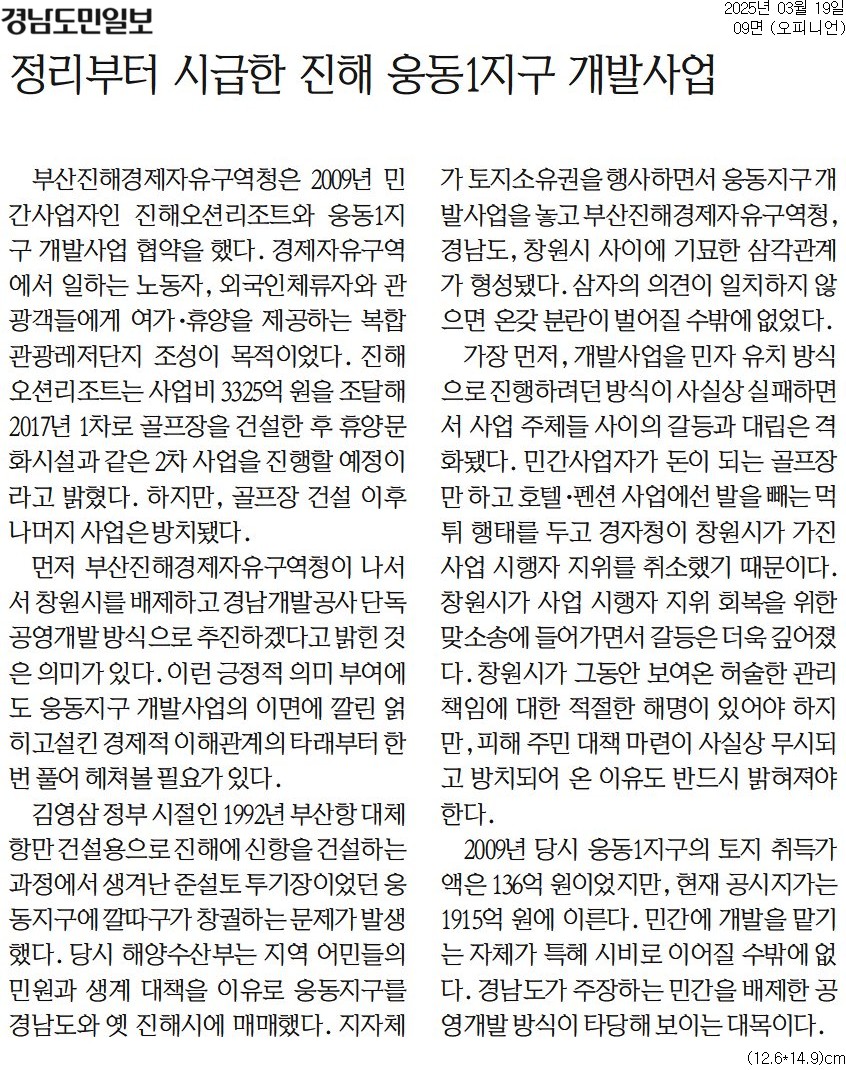 네, 창원시의회 역시 같은 날인 11일 임시회 본회의에서 전홍표 의원이 대규모 민자사업을 거론하며 투명한 행정을 주문했는데, 그 대표적인 사례로 웅동1지구 개발사업을 언급했는데요, 이에 대해 홍남표 창원시장은 이 사업이 15년 넘게 표류한 것은 2009년 사업 설계 때 건설과 운영을 분리해야 하는데 당시 건설과 운용을 묶어서 진행했기 때문이라고 진단을 내놓기도 했습니다. 창원시는 지난해 3월 사업시행자 지위를 박탈당하고 나서 항소를 진행하고 있는 중입니다. 이러한 것 역시 공영개발사업으로 추진해야 한다는 경남도와 의견이 부딪히는 부분이기도 합니다.