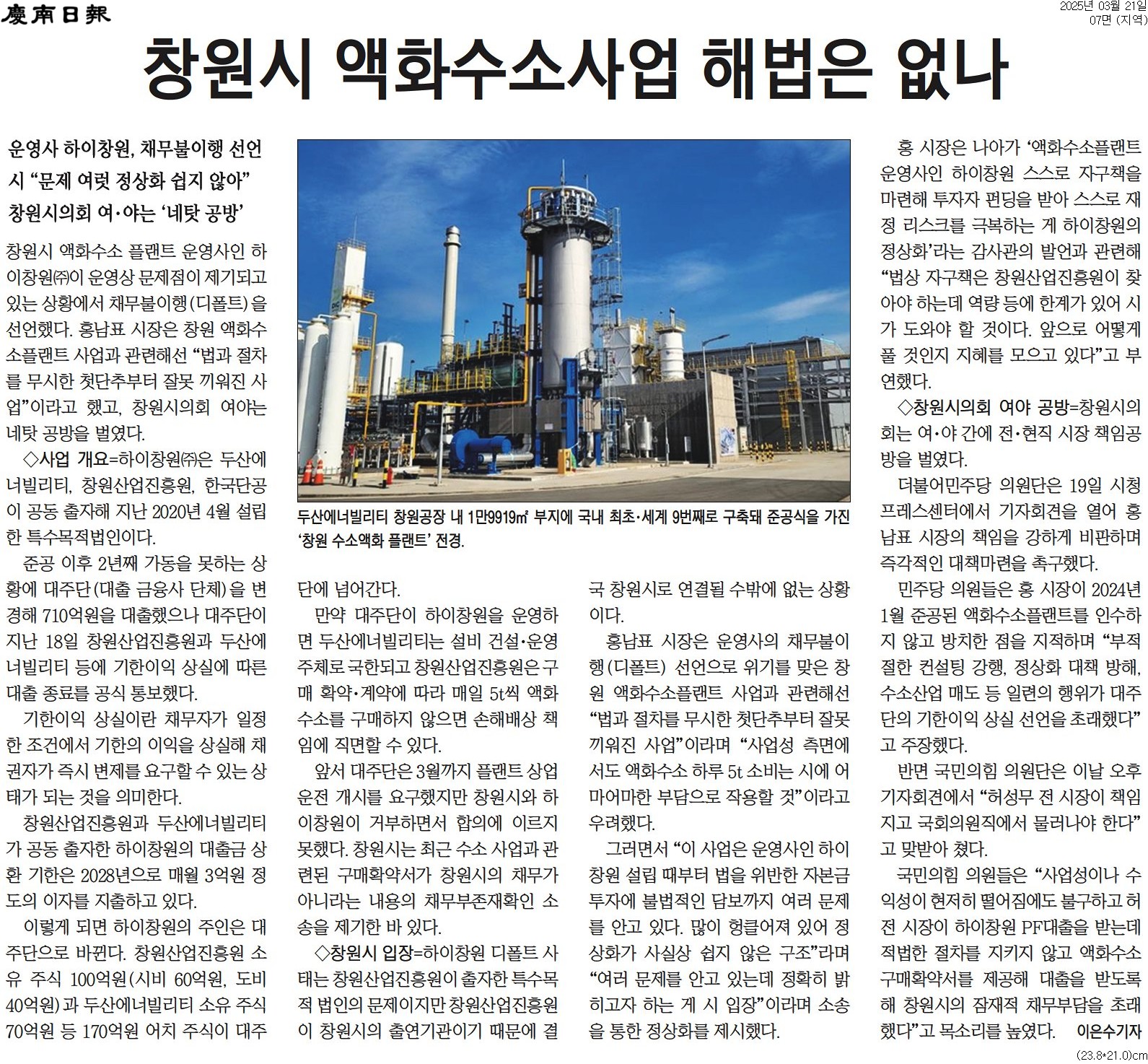 홍남표 창원시장이 2024년 1월 준공된 액화수소 플랜트를 인수하지 않고 방치한데 이어 감사관을 동원해 부적절한 컨설팅을 강행하고 정상화 대책을 의도적으로 방해한 결과 대주단이 기한이익상실을 선언하는 직접적인 원인을 제공했다는 거죠. 그 결과 창원시와 경남도, 한국산업단지공단이 투자한 270억 원의 공적 자금이 회수 불가능한 상황에 놓였으며, 금융권 대출 710억 원과 두산에너빌리티가 70억 원을 투입한 수소액화사업은 법적 분쟁에 휘말리게 됐으니 창원시민의 혈세를 낭비하고 지역 경제의 핵심 성장 동력을 심각하게 훼손했으니 책임을 지라는 주장입니다.