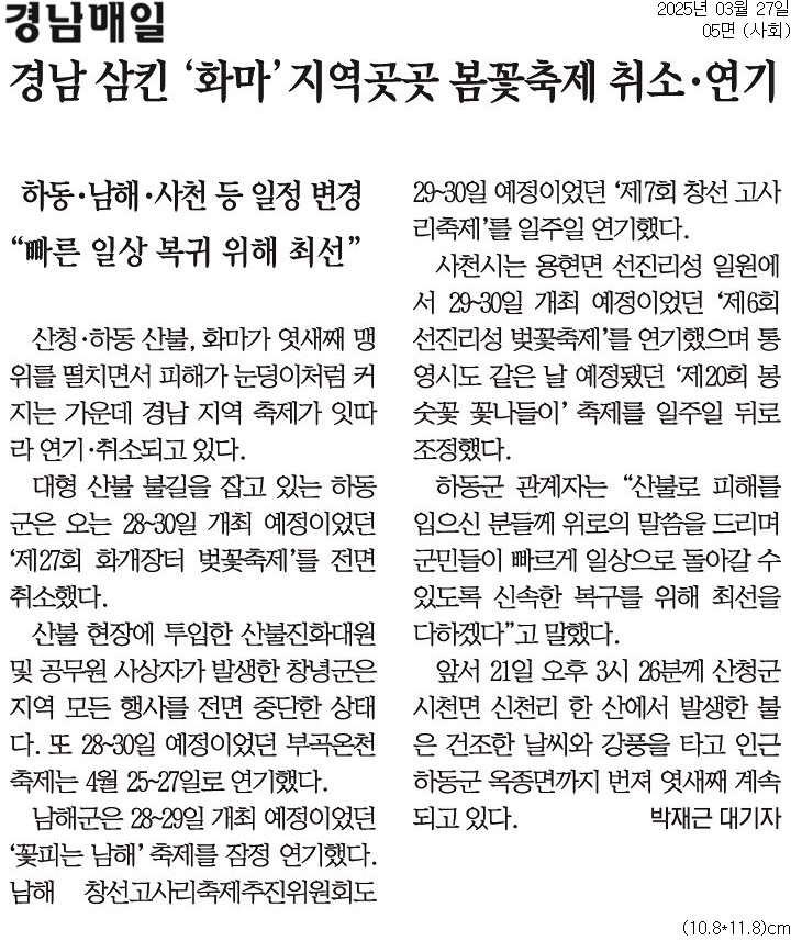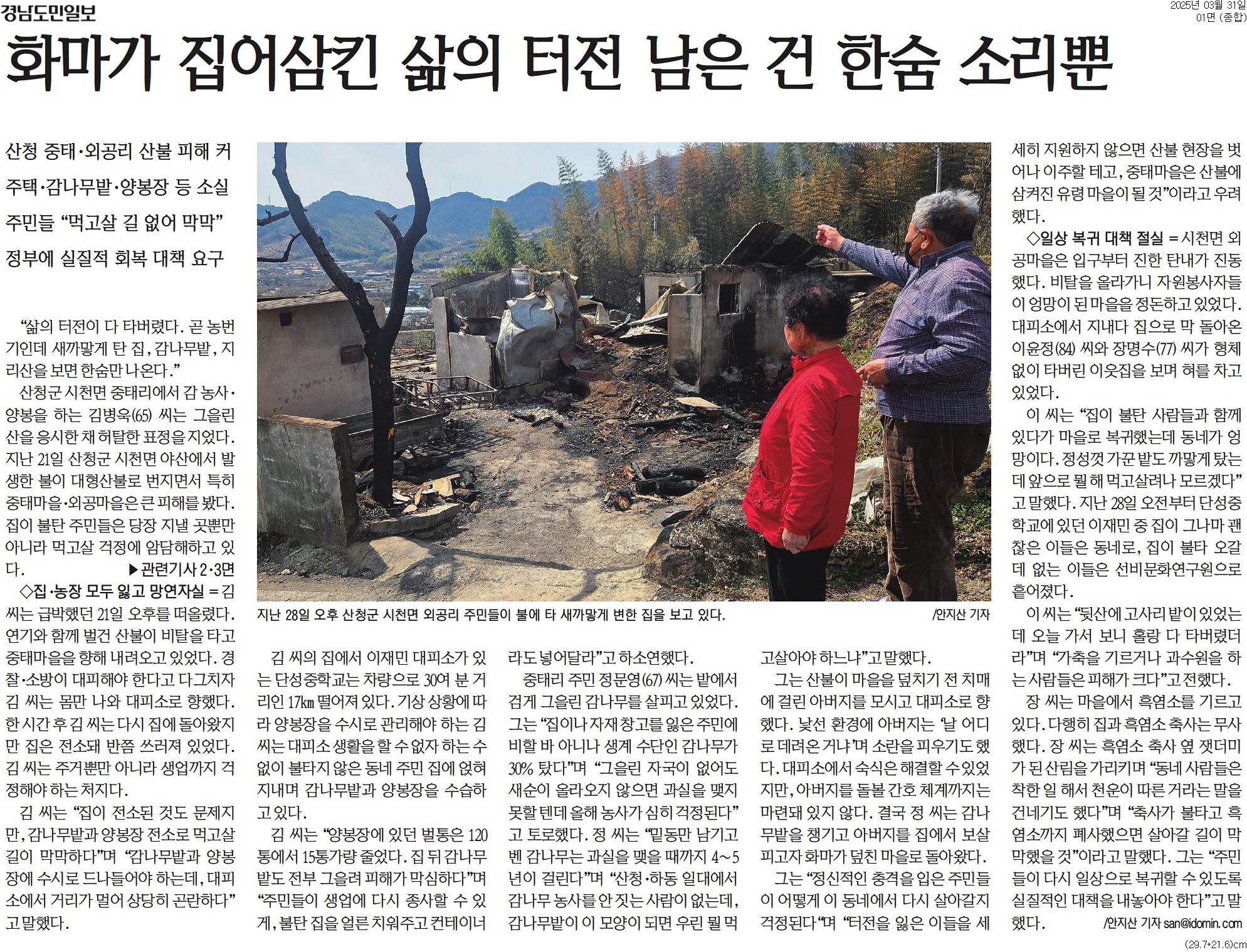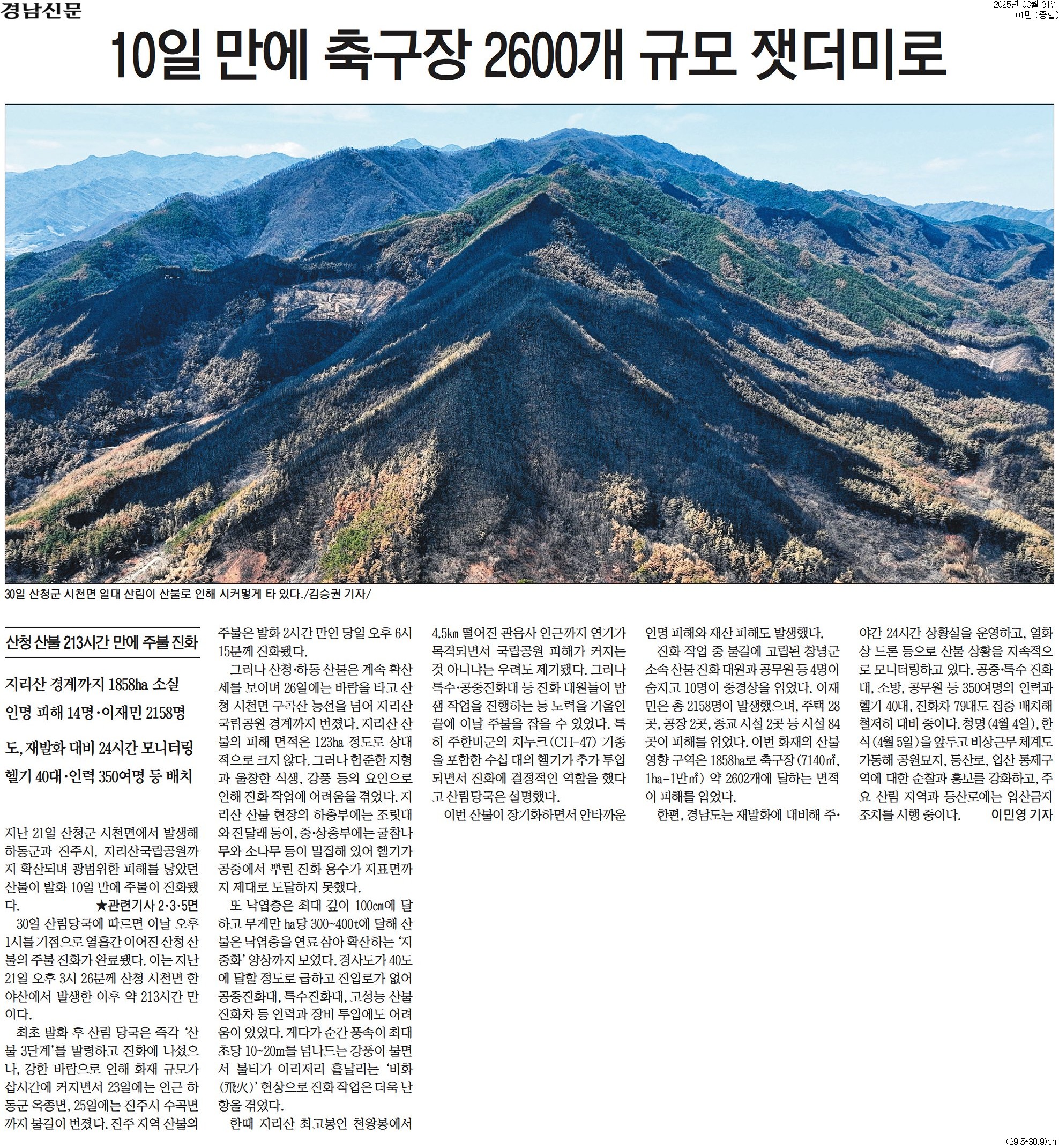 네, 그러죠. 산청 하동 진주에 걸친 지리산뿐만 아니라 의성 안동 청송 영덕에 걸친 영남권 산불, 그리고 울주군에서 발생한 울산산불 등 전국적으로 큰 산불이 3월 중순 이후 동시다발로 일어났다가 지금은 거의 진화가 마무리된 상태입니다. 경남에 속하는 지리산 산불은 아직 공식 피해 규모가 나오진 않았지만, 역대 최대 규모라 하겠습니다. 100% 산불이 잡혔다고 해도 아직 안심할 상황은 아닙니다. 두터운 낙엽층 아래에 남아있을 잔불이 되살아날 가능성도 얼마든지 있으므로 소방청 관계자뿐만 아니라 우리 도민들도 ‘꺼진 불도 다시 보자’는 심정으로 주의해야겠습니다. 그리고 피해 집계라든지 보상책 등 피해국민이 일상을 되찾을 수 있게 적극적인 지원이 뒤따라야겠습니다.
