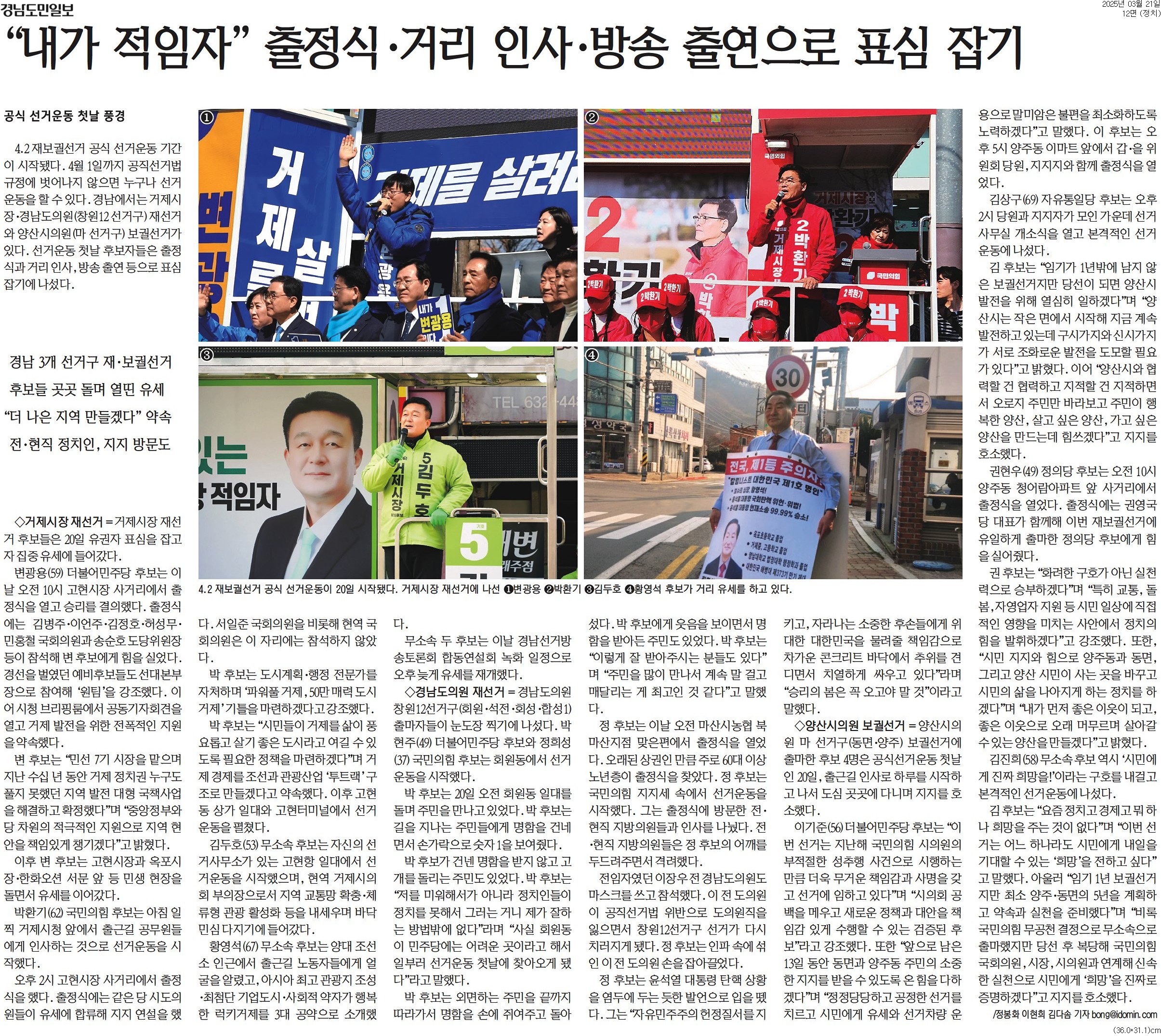 예, 도내 세 곳 재보궐선거에서 국민의힘은 재선거 두 곳만 후보를 내고 보궐선거로 치러지는 양산시의원 선거에는 후보를 내지 않았는데요, 양산에서 보궐로 치러지는 이유는 국민의힘 소속 김태우 양산시의원이 여성 공무원을 강제 추행한 혐의로 추문에 휩싸이자 사퇴했기 때문입니다.