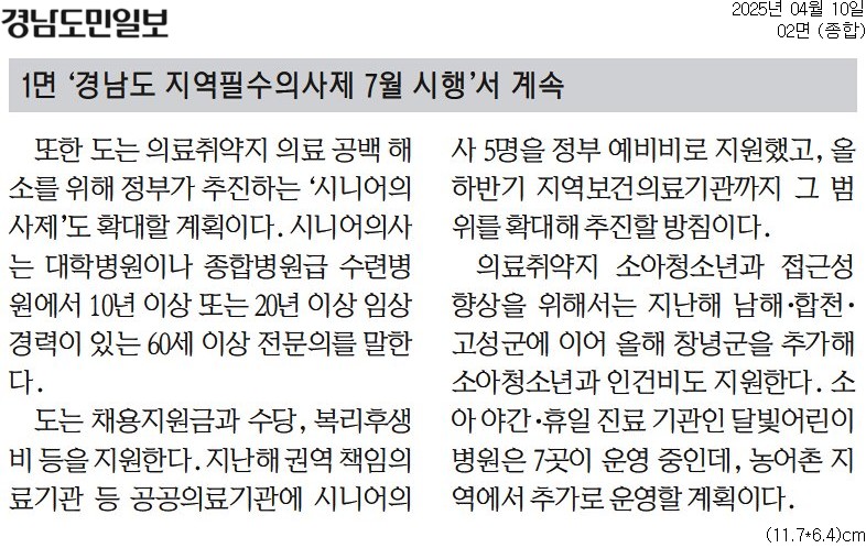 예, 시니어 의사제가 제대로 효과를 보려면 충분한 준비와 지원이 있어야겠습니다. 그리고 경남도는 24시간 소아응급환자 진료가 가능하도록 경상국립대병원과 삼성창원병원, 그리고 창원경상국립대병원에 전문의 인건비 15억 원을 지원합니다. 그리고 의료취약지 소아청소년과 지원사업도 작년 남해, 합천, 고성 3곳에서 올해는 창녕군을 추가해 지원합니다. 달빛 어린이 병원 7곳도 추가 확대할 운영입니다.