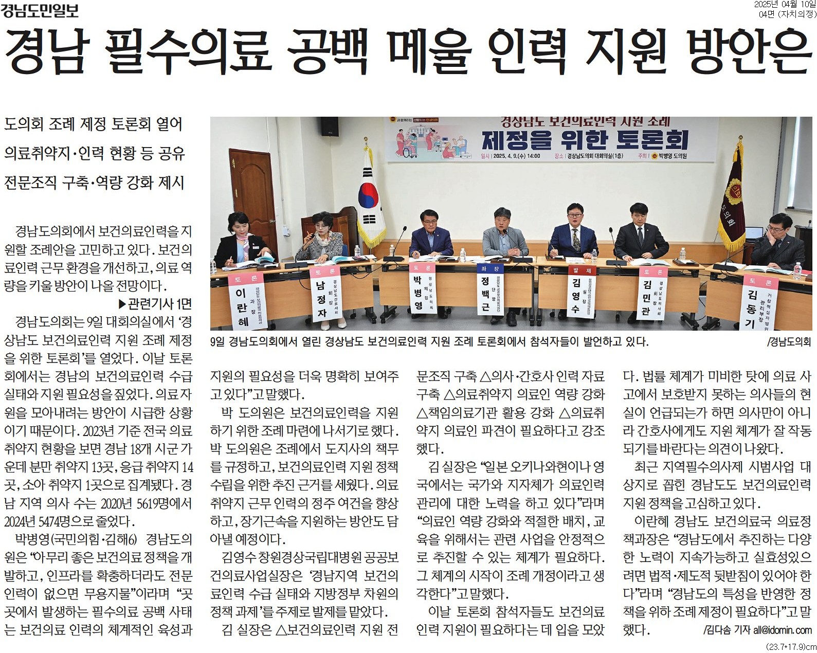 예, 경남도의회가 지역의 보건의료인력의 근무환경을 개선하고 의료 역량을 키우기 위해 국민의힘 박병영 경남도의원 주최로 지난 9일 경남도의회 대회의실에서 개최됐습니다. 이날 토론회에서 먼저 경남의 보건의료인력 수급 실태가 언급되었는데요, 2023년 기준으로 전국 의료취약지 현황에 경남은 분만취약지 13곳, 응급취약지 14곳, 소아 취약지 1곳으로 집계됐고 경남의 의사수는 2020년 5619명에서 2024년 5474명으로 줄었다고 했습니다. 박병영 의원은 이 자리에서 “아무리 좋은 보건의료정책을 개발하고 인프라를 확충하더라도 전문인력이 없으면 무용지물이라면서 의료공백 사태는 보건의료 인력의 체계적인 육성과 지원의 필요성을 더욱 명확히 보여준다”라고 말했습니다.