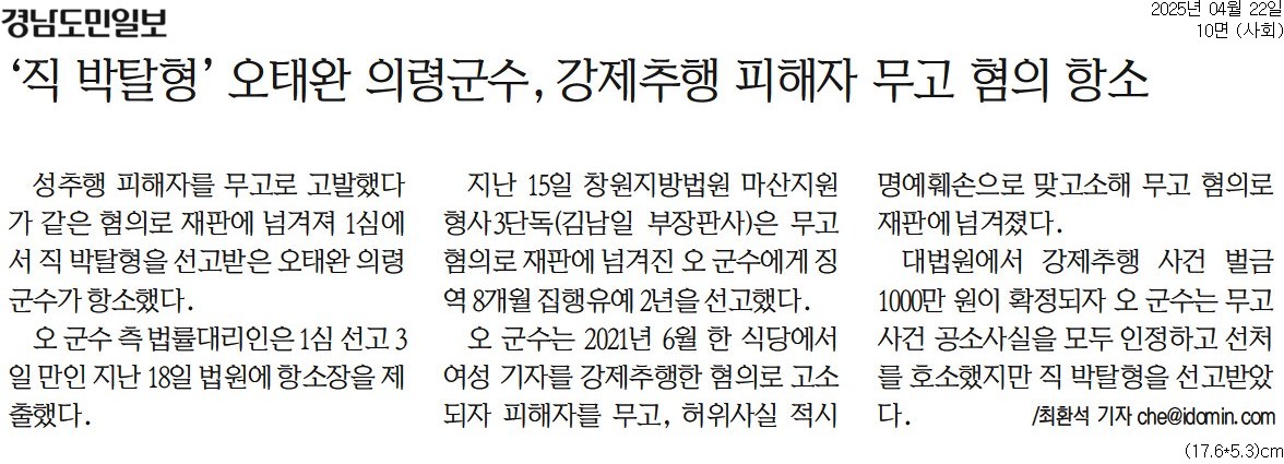 예, 이날 오태완 군수의 강제추행 사건에서 위증한 혐의로 고소당한 의령 지역 언론인 3명에게도 각각 징역 6개월에 집행유예 2년씩 선고했습니다. 이들은 오태완 군수의 범행을 목격하고도 사실과 다르게 진술한 혐의입니다.