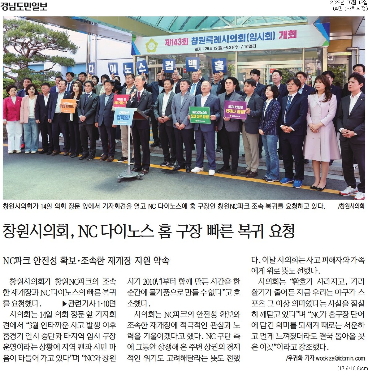 5. 그런데 창원시의회가 NC다이노스의 조속한 창원 홈경기를 바라면서