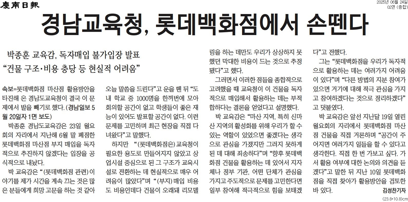 박종훈 교육감은 6월 초에 폐점한 롯데백화점 마산점을 방문할 예정이라고 합니다.