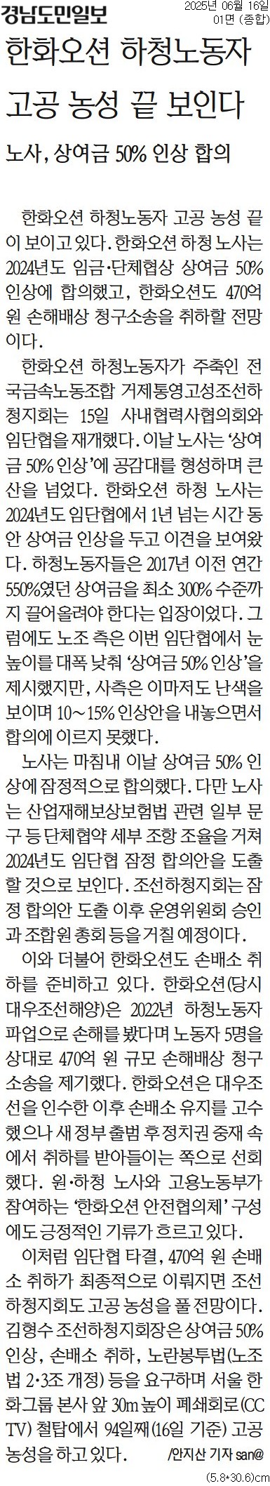 그렇습니다. 김형수 지회장은 원청인 한화오션의 책임 회피에 대해 꾸준히 문제를 제기해 왔습니다.