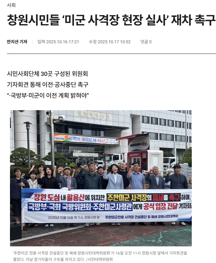 이어 지난 16일 주한미군 전용 사격장 건설 중단 및 폐쇄 창원시민대책위원회가