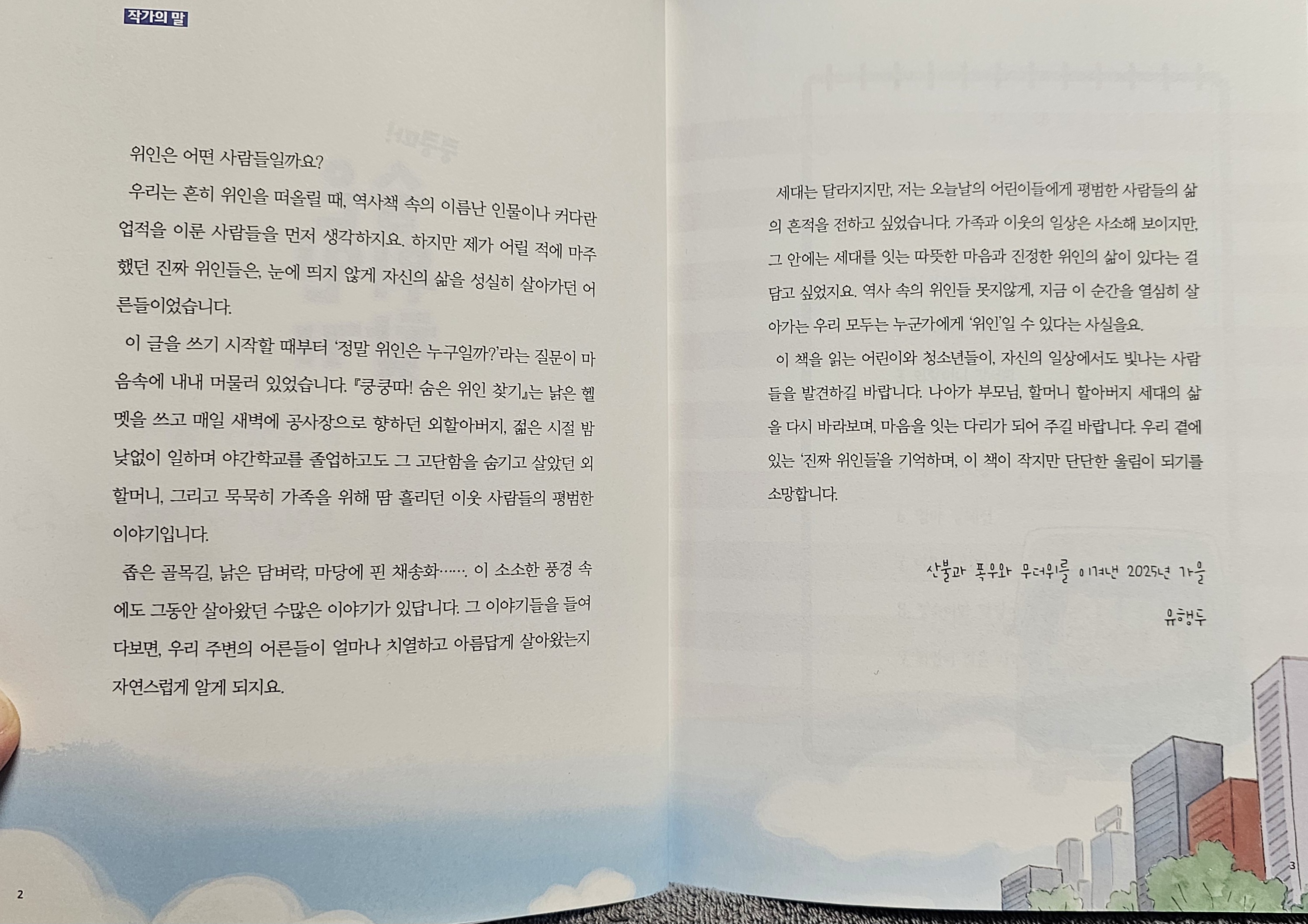 유행두 작가는 ‘작가의 말’에서 “가족과 이웃의 일상은 사소해 보이지만, 그 안에는 세대를 잇는 따뜻한 마음과 진정한 위인의 삶이 있다는 걸 담고 싶었다”고 했다. 책먹는고래. 1만3000원.