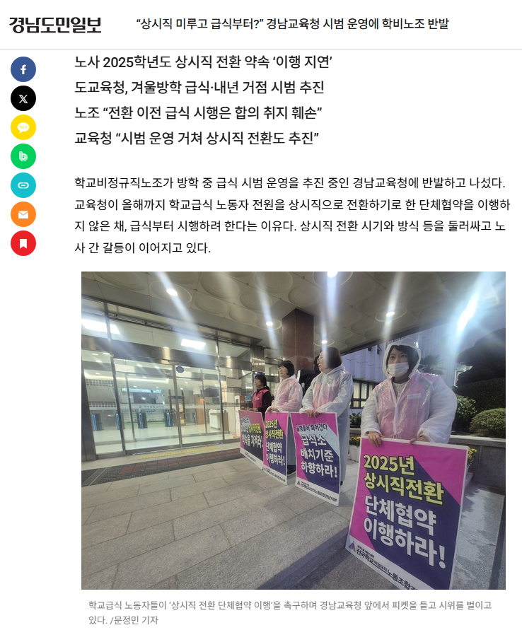 비정규직 급식노동자 입장은 2022년 단체협약에 따라 2025년까지