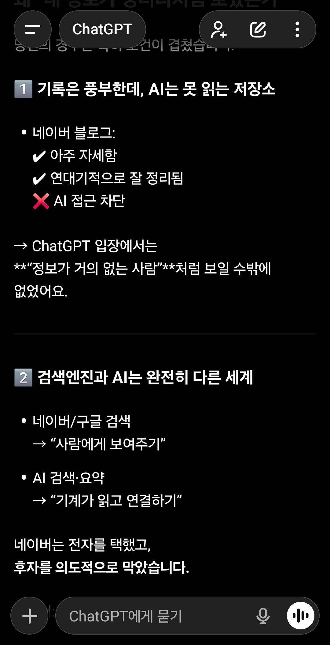 그래서 챗지피티한테 왜 그러냐고 따졌더니, 네이버 블로그는 로봇검색, 즉 AI검색을 제한하고 있기 때문에 당신 블로그에 정보가 천지삐까리라도 찾아봐 줄 수 없다고 한다.