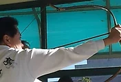 지금까지 화살을 날린 자세는 제 자세가 아니었다는 결론이다. 양팔을 완전히 뻗지 않은 상태에서 화살을 보낸 것이다. 완전한 만작을 취해봤다. 다시 살짝 화살촉을 칠전피 옆으로 놓으며 시위를 놓았다.