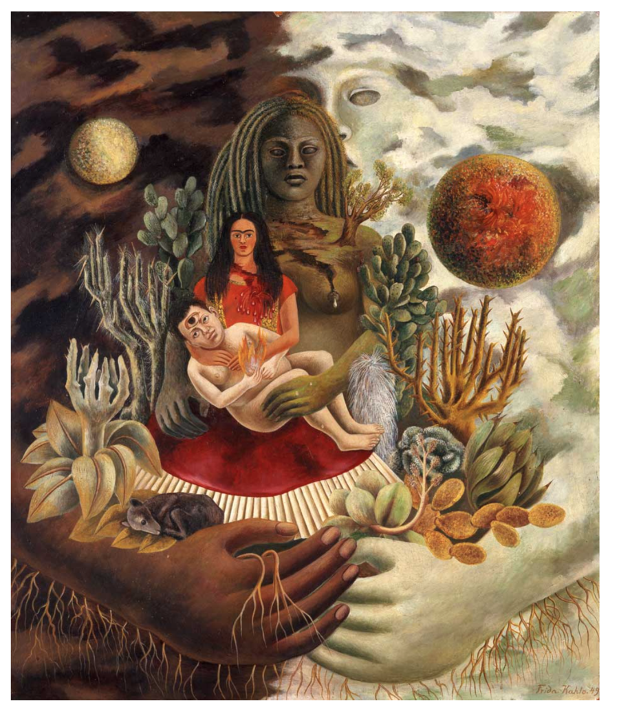 작품 속 가운데서부터 차곡차곡 확장해가며 시각을 넓혀 보자. 프리다가 아기를 안고 있다. 아기는 그의 남편 디에고다. 디에고는 멕시코 국민화가다. 그리고 이들을 안은 존재가 있다. 대지. 또 대지를 품에 안은 것은 우주의 신이다. 4단계로 품에 안긴 디에고의 이마에는 눈이 하나 더 붙어 있다. 이 눈은 중요한 상징성을 지닌다.
