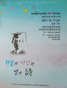 요즘 시낭송회는 다양한 형태로 진행되나보다. 한 사람이 시를 읊는 형태는 이제 고전이 된 듯하다. 시낭송가가 시를 읊는 동안 배우가 상황극을 펼치기도 하고 두 사람이 출연해 시낭송을 이어가는가 하면 세사람이 시 하나를 번갈아 읊기도 한다. 그냥 시를 읊는 것이 아니라 우산을 쓰기도 하고 이리 저리 자리를 옮겨다니며 시를 읊기도 한다. 17일, 화요일 오후 7시 창원 마산올림픽기념관 공연장에서 경남재능시낭송협회의 정기공연이 펼쳐진다. 윤동주 시 '하늘과 바람과 별과 시'가 제목이다. 올해 동주 탄생 100주년이란다. 추억, 사랑, 쓸쓸함, 동경, 시, 어머니.... 패, 경, 옥, 비둘기, 강아지, 토끼, 노새, 노루, 프랑시스 잠, 라이너 마리아 릴케.... '별 헤는 밤'에 등장하는 단어들. 그리움이란..