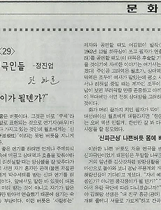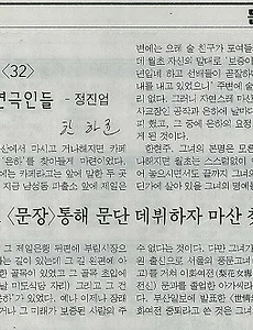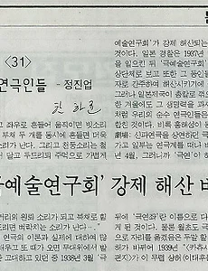 분류 전체보기1360 [한하균 오동동야화]월초가 관심을 가진 여인 한현주 월초가 문단에 데뷔하여 금의환향한 이야기. 무엇보다 월초가 관심을 보였던 한현주라는 여성이 등장하는데 글을 베껴 쓰면서도 그가 경남연극에 어떤 역할을 했기에 한하균 선생이 주목해서 이야기를 풀어나가는지 궁금하다. 문득, 현재 경남연극인들 중에 이런 이야기로 관심을 끌 수 있는 인물이 누가 있을까 궁금해진다. 일정 말기인 1930년대 말, 우리 나라의 유일무이한 문학전문지인 에 그렇게도 간절히 소망하던 문단 데뷔의 일차 관문을 통과하게 되자 월초는 그리운 고장 마산을 찾아와 온 시중을 휩쓸고 다녔다. 그 당시 마산 시중이래야 신마산은 70% 가까이가 일본인이 모여사는 신시가지였고 구마산은 거의 전부가 한국인이 취락하여 사는 보수색이 짙은 마을이었다. 다만 오동동만이 술집이 많이 있었지만 전통적인 노랫가락과.. 2017. 7. 23. [한하균 오동동야화31]연구생 시절 문단에 데뷔한 정진업 31화 중 홍해성이 등장하는 장면에서 왜 방송에도 종종 나왔던 유명인사가 떠올랐다. 이름이 김벌레든가... 아, 김벌래. 인터넷이 가까이 있어서 이렇게 편하다니까. ㅋㅋ. 이 양반은 여러가지 도구로 음향효과를 내는데 참 기발하기도 하단 생각을 했더랬다. 정진업이 유치진 홍해성 이런 분들한테서 연극을 공부하던 중 '극예술연구회'가 강제해산이 되었단다. 정진업으로선 얼마나 아쉬운 일이랴. 게다가 홍해성은 신파극을 하는 동양극장으로 옮겨갔다. 정진업이 좀 알아주는 연극인이었다면 같이 가잔 제의도 들었겠지. 그럼에도 다행히 한달만에 '극연좌'란 이름으로 극단이 재구성된다. 당시 일제가 아무리 밟아도 일어서던 민중처럼 극단도 그랬나 보다. 여튼 연구생 시절에 문단에 데뷔한 실력이 부럽기도 하지만... 내 글이야 .. 2017. 7. 21. [한하균 오동동야화30]서울서 유치진·홍해성과 인연 닿은 정진업 정진업이 서울로 연극 공부를 하러 가서 만난 사람이 유치진과 홍해성이라고 한다. 물론 이광래가 내쳤더라면 그마저도 불가능했을 인연이었겠지만, 어쩌면 번역 일을 하면서 '극예술연구회'가 주최한 강습회에 참여할 수 있게 된 것만 해도 여간 다행한 일은 아니었겠다. 이러한 역사적 사실들을 들여다 보면 좋은 스승을 만나는 것만큼 중요한 일도 없겠다 싶다. 월초가 서울에 갔을 때의 광래는 극작가로서보다도 오히려 문화부 베테랑 기자로 더욱 명성이 높았을 때였다. 광래는 연극을 배우겠다고 찾아온 고향 후배를 매몰차게 되돌려 보낼 수는 없고 여러 가지 궁리를 하다가 우선 검열대본 번역일을 맡겨 보기로 했다. 당시는 우리나라 말로 연극을 할 수 있을 때였는데(왜정 말기에는 일본말로 대사를 주고 받아야 했으니까) 우리 나.. 2017. 7. 20. [한하균 오동동야화29]김해랑 정진업에 이르기를 "풍각쟁이가 될텐가?" 신극이 유행하고부터는 신파극은 신극운동을 하는 사람들에겐,말하자면 경멸의 대상이 되었나 보다. 무용을 하는 김해랑마저도 정진업이 혁신단을 따라다니자 나무라며 하는 말이 "자네, 예술을 할 셈인가? 풍작쟁이가 될 텐가" 했다 하니 말이다. 대사 한마디 한마디에 관객의 박수를 이끌어내던 신파극의 독특한 플롯 구조가 당시 관객에게 먹혀들어갔을 터이다. 암튼 김해랑의 소개로 정진업은 이광래를 만나게 되나 보다. 극단이 해체되는 비운을 겪은 뒤 이듬해인 1935년 이른 봄에 전기 천적막이 다시 불러 갔더니 역시 '극예사'란 간판을 걸고 소인극단체를 만들어 영남 일대를 순회공연하는 것이었다. 공연 작품은 월초 자신이 말씀하신 대로다. "창피하게도 옛날 임성구의 혁신단에서 공연했던 등이었다." 여기에서 연극인 정진업.. 2017. 7. 18. [한하균 오동동야화28]비운으로 시작된 월초의 첫 연기인 생활 오동동야화 28화. 원본엔 26화 라고 표기되어 있는데 번호를 잘 못 매겼다. 월초가 마산상업학교를 졸업하고 연극계로 진출한 이야기. 그런데 마산의 첫 신극 단체라 할 수 있는 '극예사'가 처음엔 김여찬, 이훈산 등의 아나키 성향의 사람들에 의해 만들어졌는데 나중에 혁신단 신파극 출신의 천전막이 맡으면서 친일로 흘렀다는 얘기에 가슴 아프다. 또 학교 졸업하고 그저 연기만 하고 싶은 마음에 천전막의 극예사에 들어간 정진업의 운명도 안타깝고. 결국 극예사는 돈이 없어 문을 닫고 마는데... 글에는 나타나 있지 않지만 일본 제국주의의 간교한 모습이 읽힌다. 반 일제 성향의 극단을 친일 인사가 인수하게끔 해놓고 결국 그마저 활용가치가 떨어지면 가차없이 내쳐버리는... 이런 일본 제국에 속아넘어간 어리석은 인간들.. 2017. 7. 18. [한하균 오동동야화27]월초 정진업의 옛시민극장 아르바이트 학생 신분을 속이고 영화관에서 내레이터 아르바이트를 한 월초 정진업의 성숙함이 오늘 이야기의 초점인 것 같다. 이 이야기만 봐도 월초가 얼마나 정열적인 인간형인가 가늠하게 된다. 월초는 또한 왕성한 탐구욕의 소유자였다. 그 탐구욕의 소산이었다고나 할까? 그 당시 마산상고에는 전술한 아즈카 데카라 선생 이외에도 고다마, 시카사마 등 두 분 선생이 더 계셨다. 고마마 선생은 이라는 희