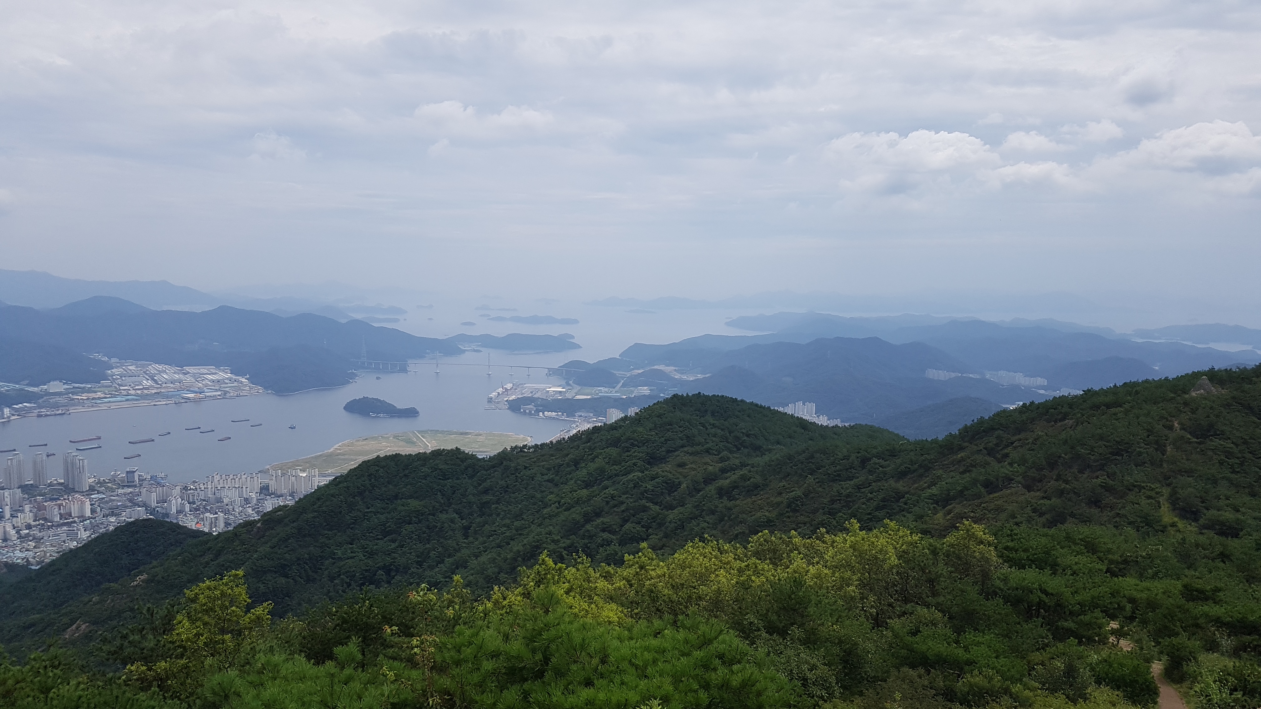 산 정상에서 내려오는 길. 마산 시내와 앞바다가 훤히 내려다 보인다. 멀리 보면 섬들이 바다를 균형있게 채워놓은 게 꼭 다도해같다.