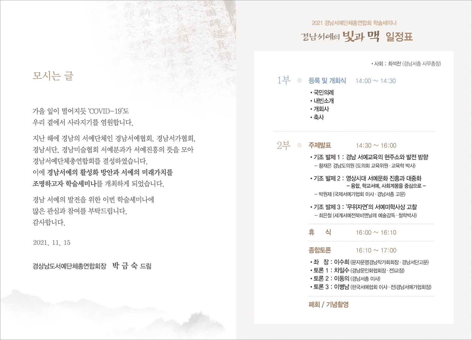 ‘경상남도 서예진흥에 관한 조례’를 대표발의한 황재은 도의원은 ‘경남 서예교육의 현주소와 발전방향’을 주제로, 박원제 이사는 ‘영상시대 서예문화 진흥과 대중화’를 주제로, 최은철 예술감독은 ‘‘무위자연’의 서예미학사상 고찰’을 주제로 각각 발표할 예정이다.