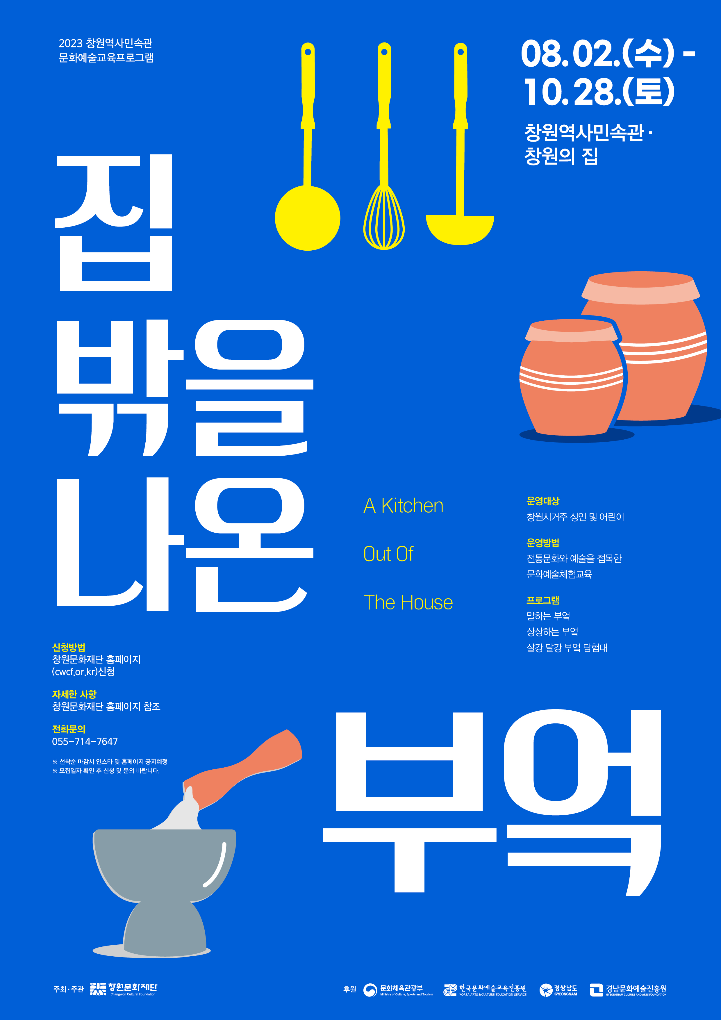 (재)창원문화재단(대표이사 조영파)은 경상남도, 문화체육관광부, 경남문화예술진흥원, 한국문화예술교육진흥원이 후원하는 2023 문화예술교육사현장역량강화사업문화예술교육 프로그램 <집 밖을 나온 부엌>을 운영한다.
