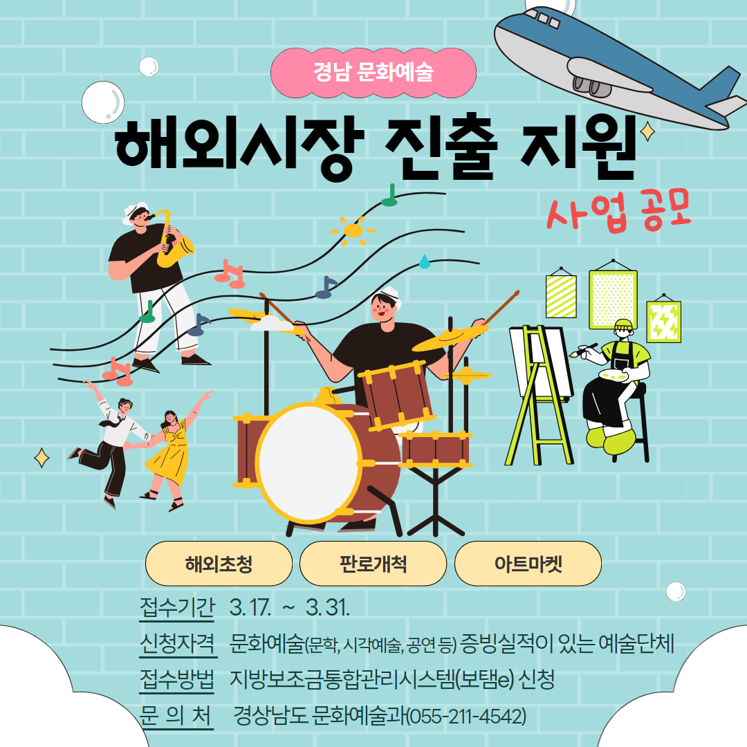 - 도내 우수 예술단체의 해외 공연·전시 및 아트마켓 개척 지원