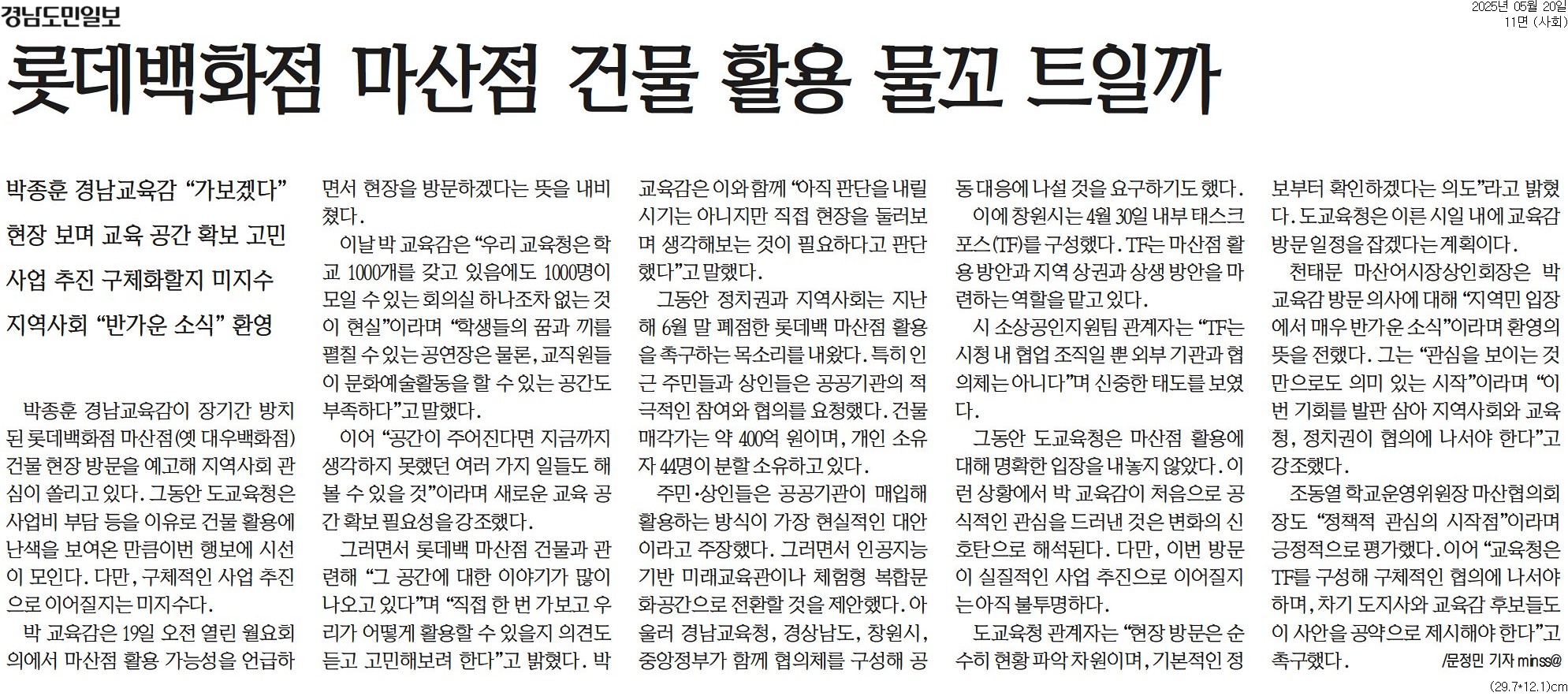 박종훈 교육감은 6월 초에 폐점한 롯데백화점 마산점을 방문할 예정이라고 합니다.