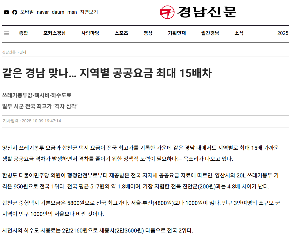 양산시 쓰레기봉투 요금과 합천군 택시 요금이 전국 최고가를 기록했다고 합니다.